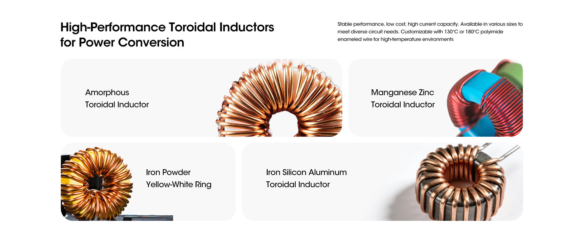 We have 4 core product lines corresponding to 4 major solutions, covering all mainstream inductor types. Each product is independently developed and optimized for its corresponding industry scenario — such as ultra-low leakage for toroidal inductors, ultra-thin design for flat inductors, precise noise suppression for filter inductors, and efficient heat dissipation for wire rod inductors, ensuring perfect adaptation to your industry needs.